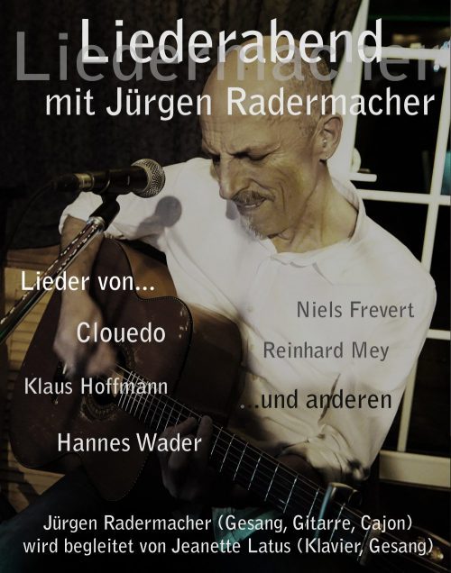 Bereits 2014 gastierte Jürgen Radermacher mit seiner Band Clouedo im Burgtorsaal in Nickenich. Dieses Mal gestaltet er, unterstützt von Jeanette Latus, einen musikalischen Abend ganz im Zeichen bekannter, deutscher Liedermacher. Puristisch, mit Gitarre, Piano, Cajon und Gesang präsentiert das Duo eine Zeitreise mit Liedern von Klaus Hoffmann, Reinhard Mey, Hannes Wader, Pe Werner und anderen Künstlern, die in diesem Genre tiefe Spuren hinterlassen haben. Natürlich werden bei diesem Konzert auch Lieder, die aus eigener Feder der Band Clouedo stammen, neu interpretiert.